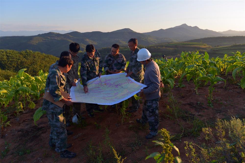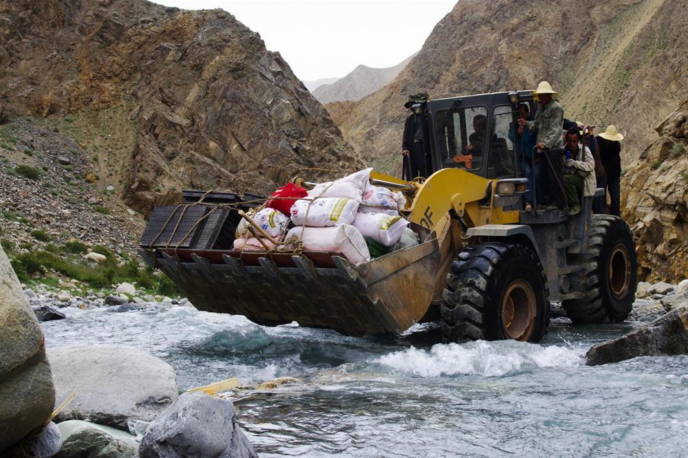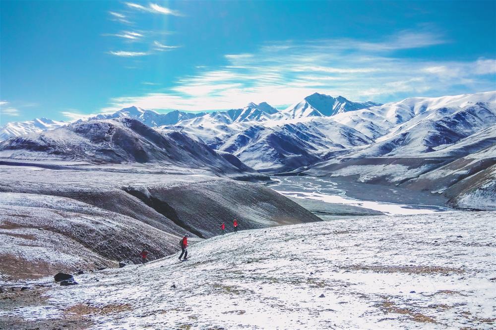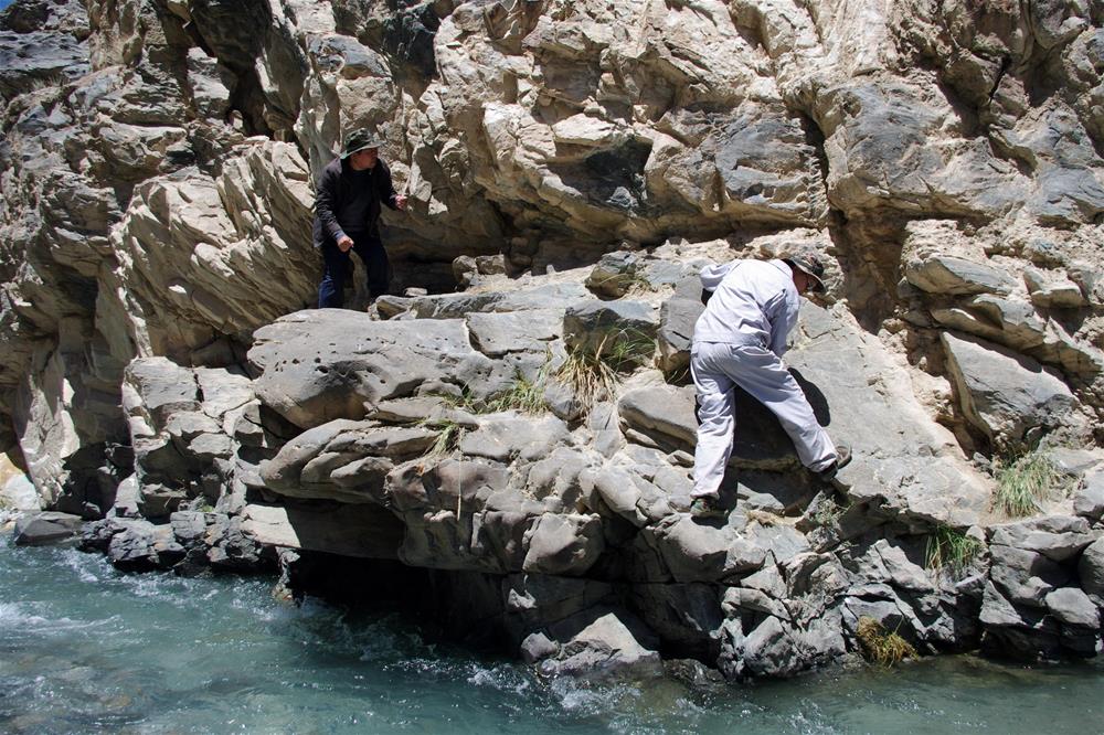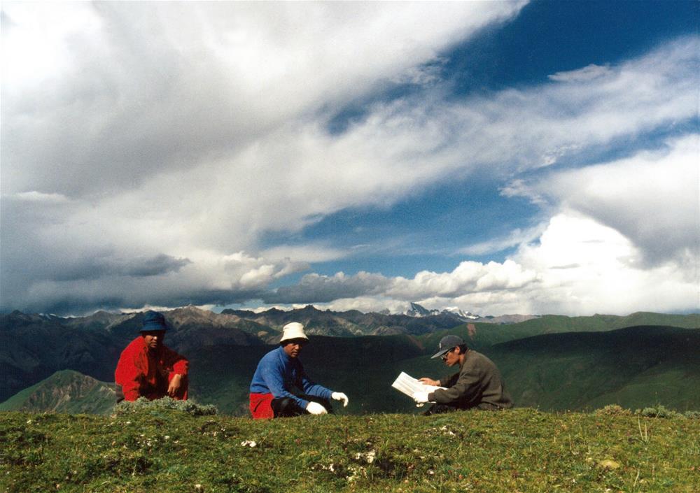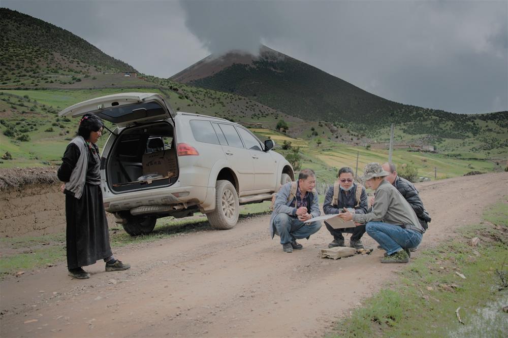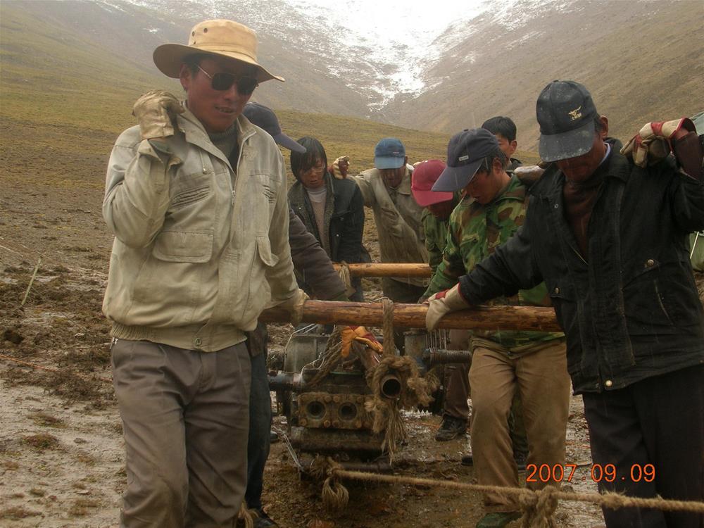 样品采集(地矿二院都鹏飞)浅井施工(地矿二院张旭东) 夕阳无限(地矿三院张明磊)路线穿越前的会议、 路线穿越在5400米(地调院董卫东)